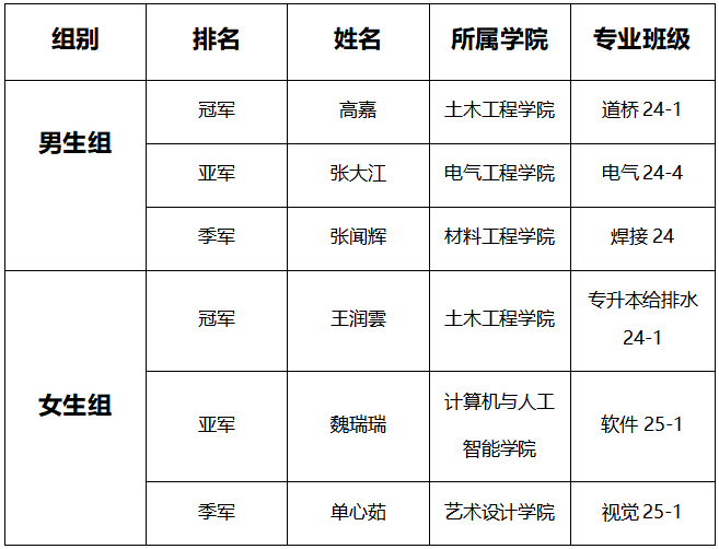 经过激烈角逐,土木工程学院道桥24-1班高嘉、土木工程学院专升本给排水24-1班王润雲分别荣获男、女组冠军。电气工程学院电气24-4班张大江、艺术设计学院视觉25-1班单心茹分别荣获男、女组亚军;材料工程学院焊接24班张闻辉、计算机与人工智能学院软件25-1班魏瑞瑞分别荣获男、女组季军。