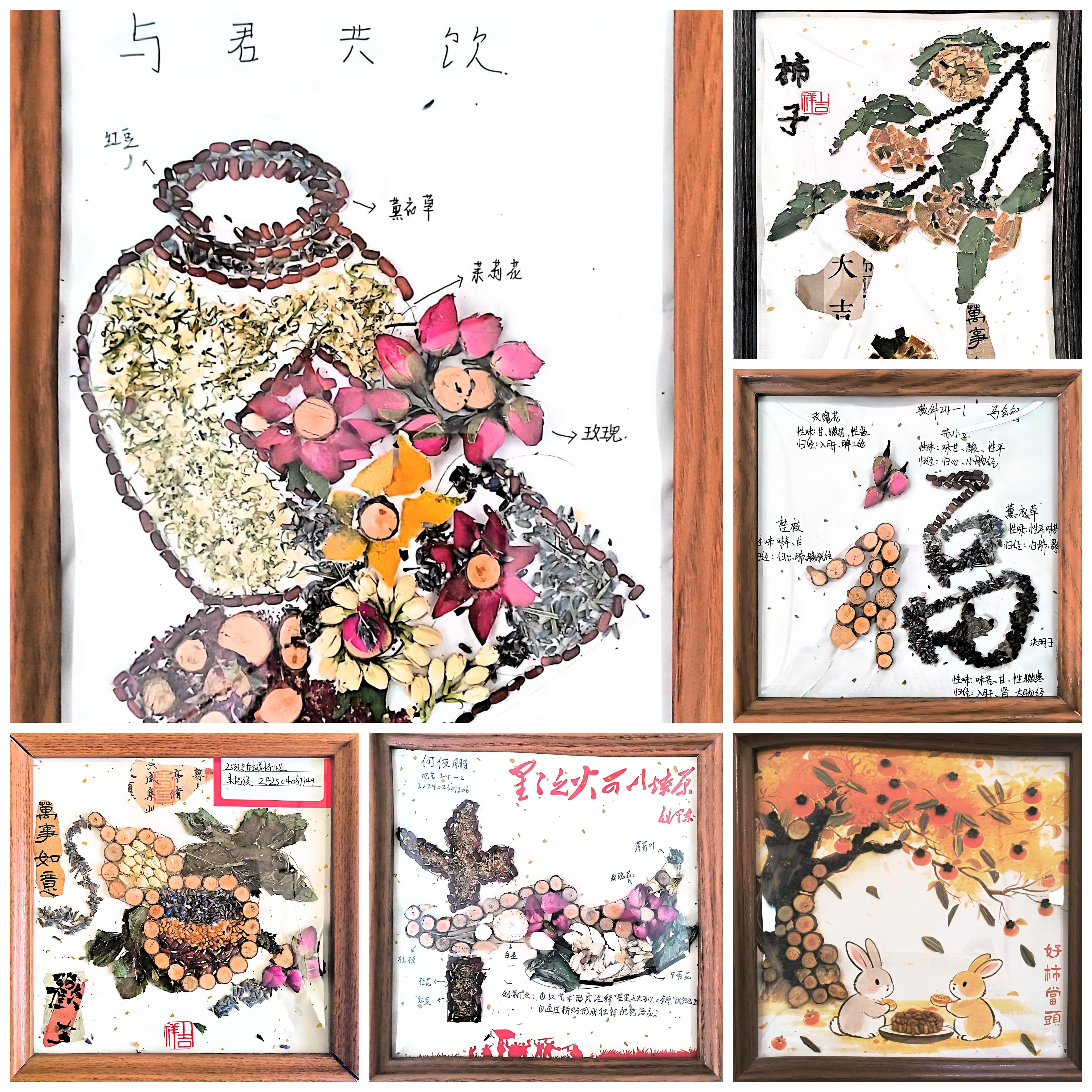 课程以沉浸式、互动式学习为特色,融合“翻转课堂”教学理念与中医药文化实践,组织学生开展八段锦习练、中药养生茶调制、创意作品设计等多元体验,引导学生在动手中感悟、在体验中创新,实现了知识传授、能力培养与文化浸润的有机统一。结课阶段,同学们呈现了一系列设计精美、构思新颖的作品,充分展现了课程的育人成效与学生的综合素养。