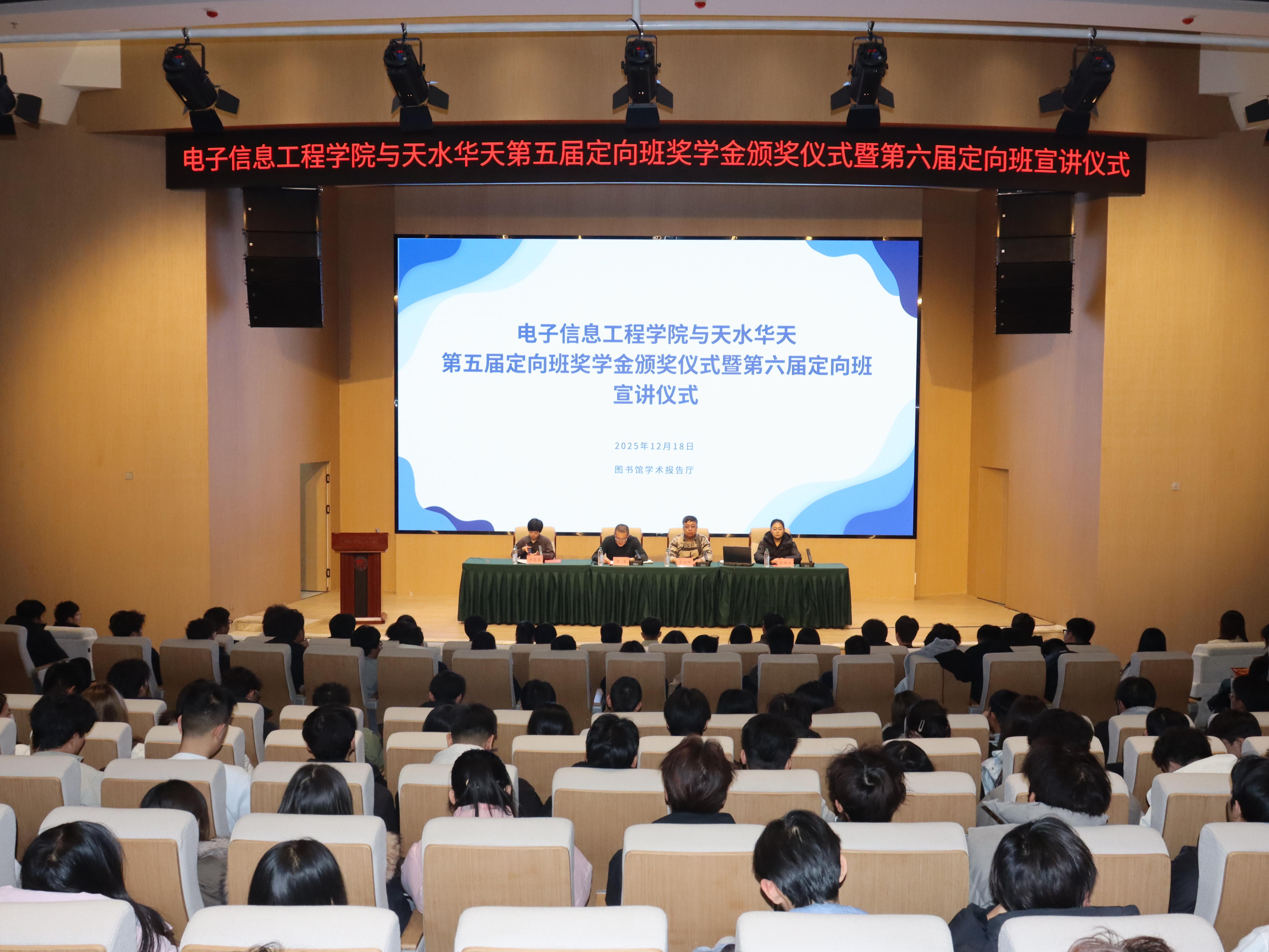 12月18日,电子信息工程学院与天水华天科技股份有限公司在兰州新区校区图书馆报告厅举行校企合作定向班第五届奖学金颁奖仪式暨第六届宣讲仪式。天水华天科技股份有限公司校企合作办公室主任吴永辉、校企合作办公室专员张梓云,电子信息工程学院副院长李伟参加宣讲仪式。