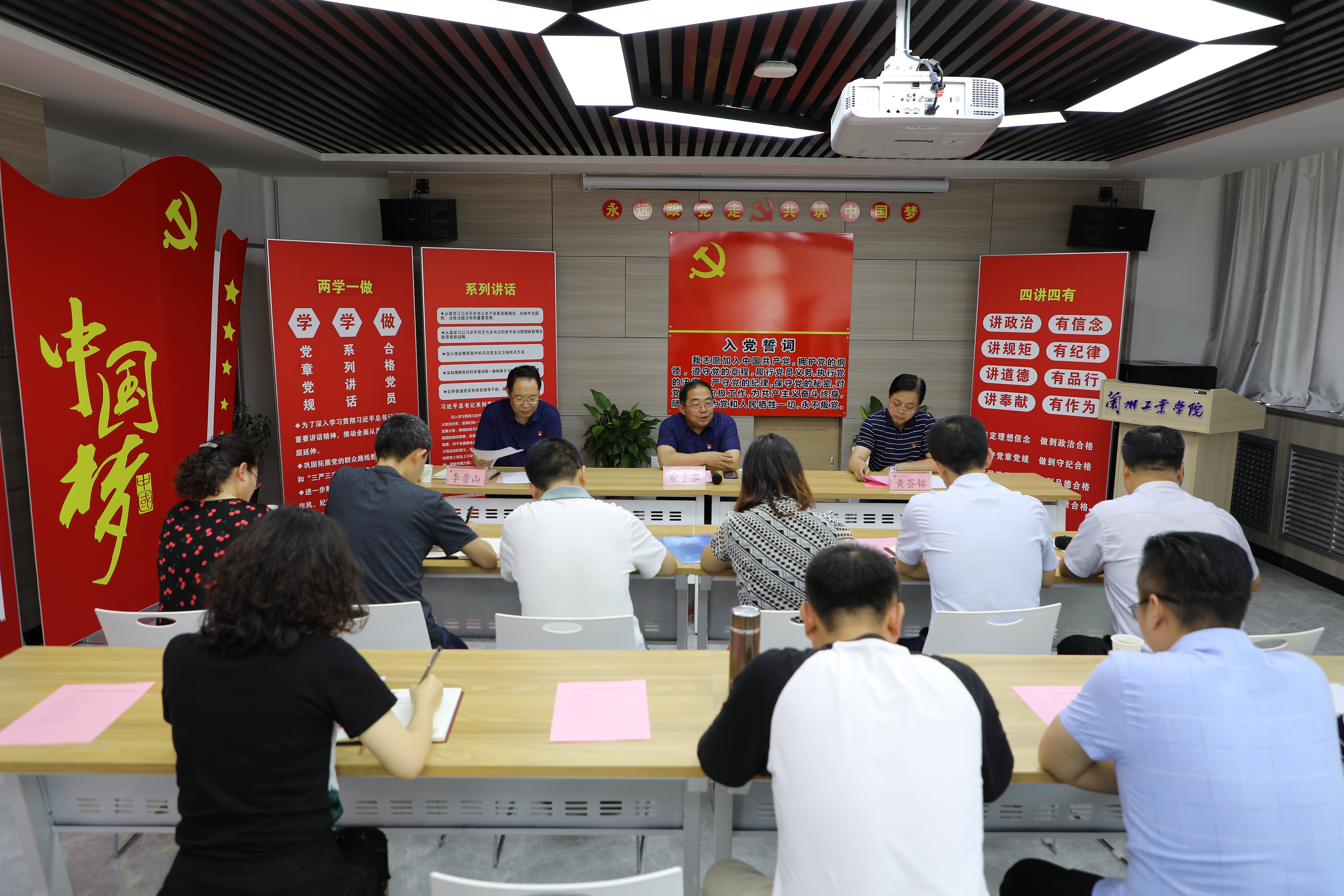 活动中,俞子泓、黄荟铭、李贵山等校领导为机关党委第五党支部党员活动中心揭牌,活动中心位于学校创新创业学院,是一个集信息展示、会议室、录播教室为一体的高标准多功能厅。随后,全体党员面向党旗重温了入党誓词,表达了党员们不忘初心,牢记使命,紧密团结在以习近平同志为核心的党中央周围,为实现中华民族伟大复兴而努力奋斗的信心和决心。