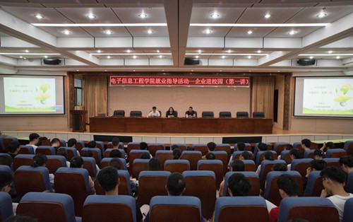 6月19日下午,甘肃瑞特森数字科技有限公司行政人事总监钱海蓉女士应邀为电子信息工程学院学子们作就业指导专题讲座。电子信息工程学院副院长陆斌主持讲座。教育部-中兴通讯ICT产教融合创新基地兰州工业学院负责人张建昌经理、企业主讲教师、辅导员、班主任、16级、17级、18级全体学生参加了本次讲座。