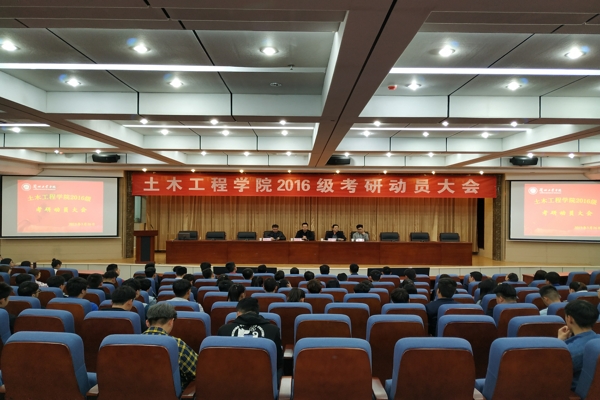 2019年3月26日下午,土木工程学院在第三学术报告厅举行2016级考研动员大会。学院院长马守才、副院长任永忠,学工办部分教师及2016级全体同学参加了会议。 会上,马守才对考研的重要意义进行了强调说明。任永忠就考研备考策略、院校和专业的选择以及考研中须注意的问题等方面作了介绍。学院王生廷博士在报告中建议同学们要有良好的心态,根据自己的实力去选择学校。最后,15级寇让成同学结合个人的考研经历向大家分享了自己的学习心得。 通过此次大会,2016级同学对当前考研形势和备考工作有了进一步的认识和了解,进一步明确了自己的考研目标。