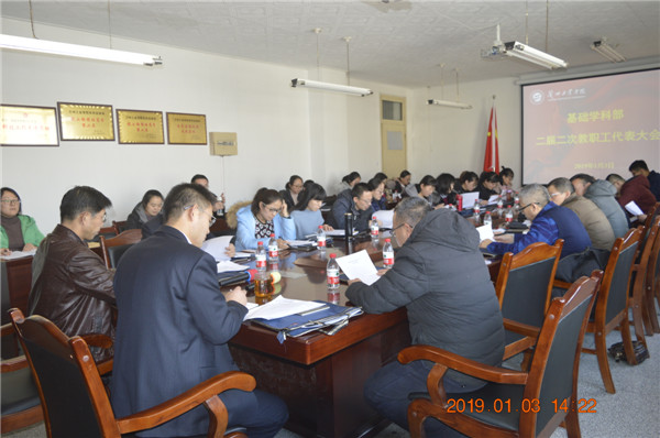 2019年1月3日下午,基础学科部在部门会议室召开第二届教职工大会第二次会议。会议由基础学科部党总支书记沈文国主持,基础学科部全体教师参加了会议。 会上,基础学科部副主任张豫冈致开幕词。基础学科部主任祁忠斌作了《基础学科部2018年度工作报告》和《基础学科部2018年度经费收支情况报告》。与会教职工就两个报告进行了讨论,并对部门今后的发展提出了宝贵的意见和建议。 会议总结了基础学科部一年来取得的成绩和不足,确定了今后一个时期基础学科部的重点工作,基础学科部将继续发扬成绩、克服不足,抓好教学、科研等工作,为学校转型发展凝心聚力,争取使各项工作更上一个新台阶。
