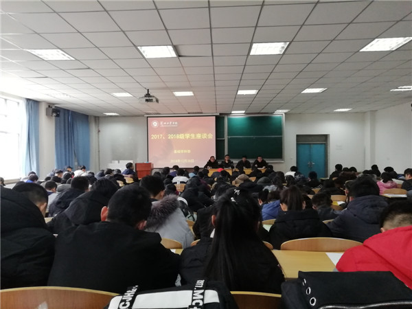 2018年12月25日,基础学科部在第四教学楼C201召开2017、2018级本科学生座谈会。基础部党总支书记沈文国,主任祁忠斌,副主任张豫冈、董珺及学生代表参加了座谈会。