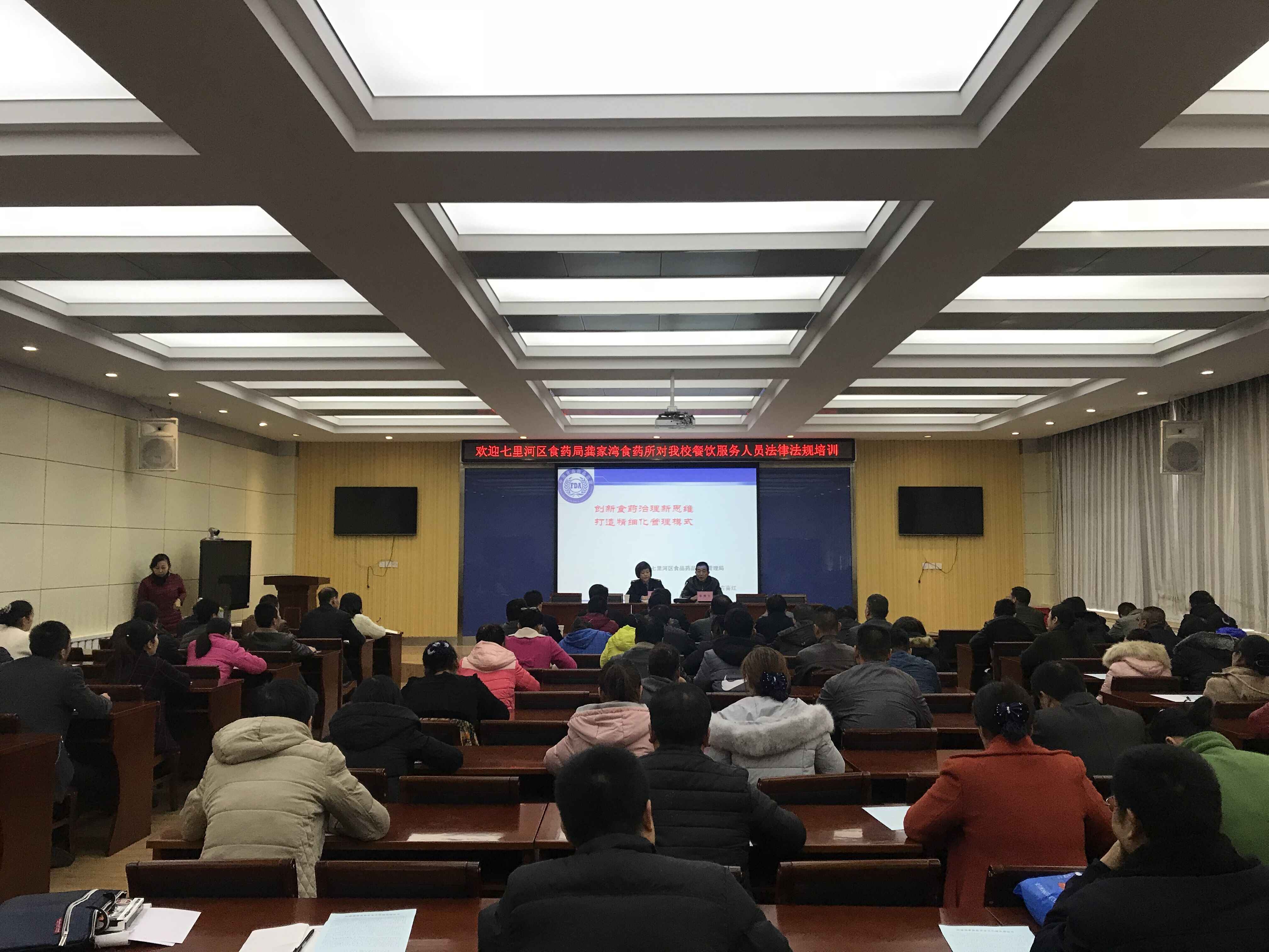11月21日下午,兰州市七里河区龚家湾食药所对我校饮食服务中心管理人员及炊事人员进行了法律法规及餐饮规程的培训。龚家湾食药所所长方喜红作了题为《创新食药治理新思维、打造精细化管理模式》的讲座,饮食服务中心100余人听取了讲座。