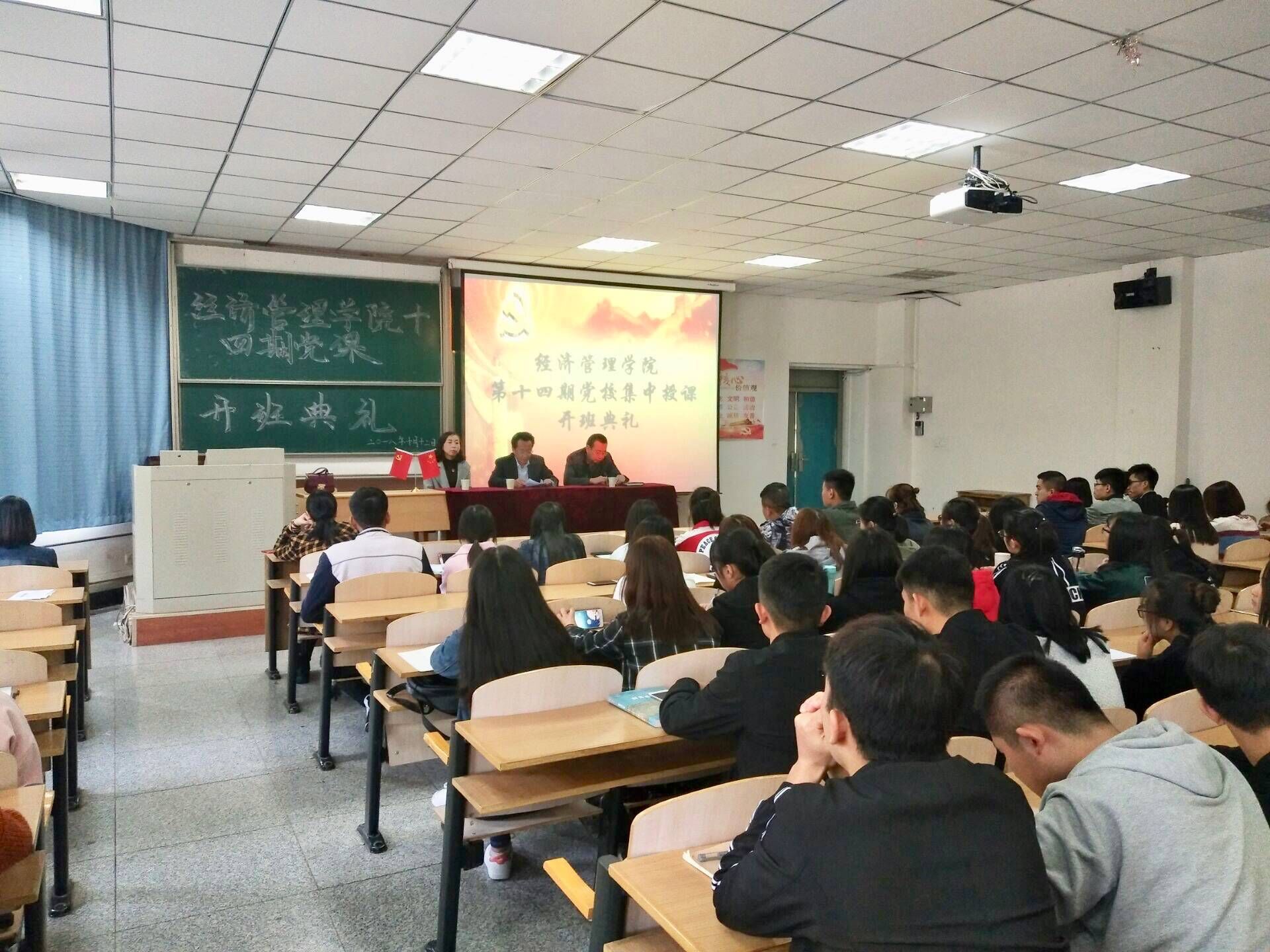 2018年10月13日中午,经济管理学院在四教C102教室举行第14期党课开班典礼。学院党委书记王春升、副院长牛永红、学生党支部书记司浩婷以及70多名入党积极分子参加了开班典礼。
