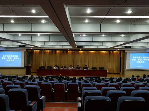9月13日,电子信息工程学院在第三学术报告厅召开2019届毕业生就业、考研、专升本动员大会,学院党委书记李萍,副院长赵又新、陆斌、李伟及全体辅导员、毕业班班主任参加了大会,学工办主任彭琳茹主持大会。 会上,赵又新介绍了学院历年考研、专升本、四六级情况,并向同学们介绍了毕业实习等相关教学安排;陆斌从目前的就业形势、就业的相关准备,就业资源利用,就业方向及流程出发作了动员讲话;李伟现身说法,为同学们作了备考专题讲座。李萍强调了就业安全方面的问题,鼓励同学们树立正确的就业观、择业观,为学校,为家人,为自己送上一份满意的答卷。