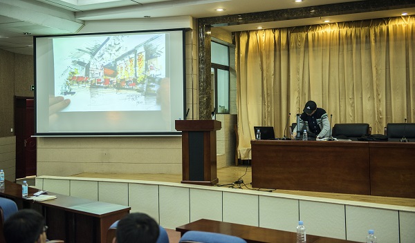 博锋用实物投影仪向大家演示了徒手草图展示的方法,用案例分析重点介绍了创意手绘设计的元素与主题展现,对手绘与设计、职业认证、客户沟通及与手绘相关专业考研的技巧等进行了详细讲解。讲座内容丰富、深入浅出,实用及实践性强,受到师生们的欢迎。