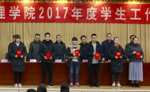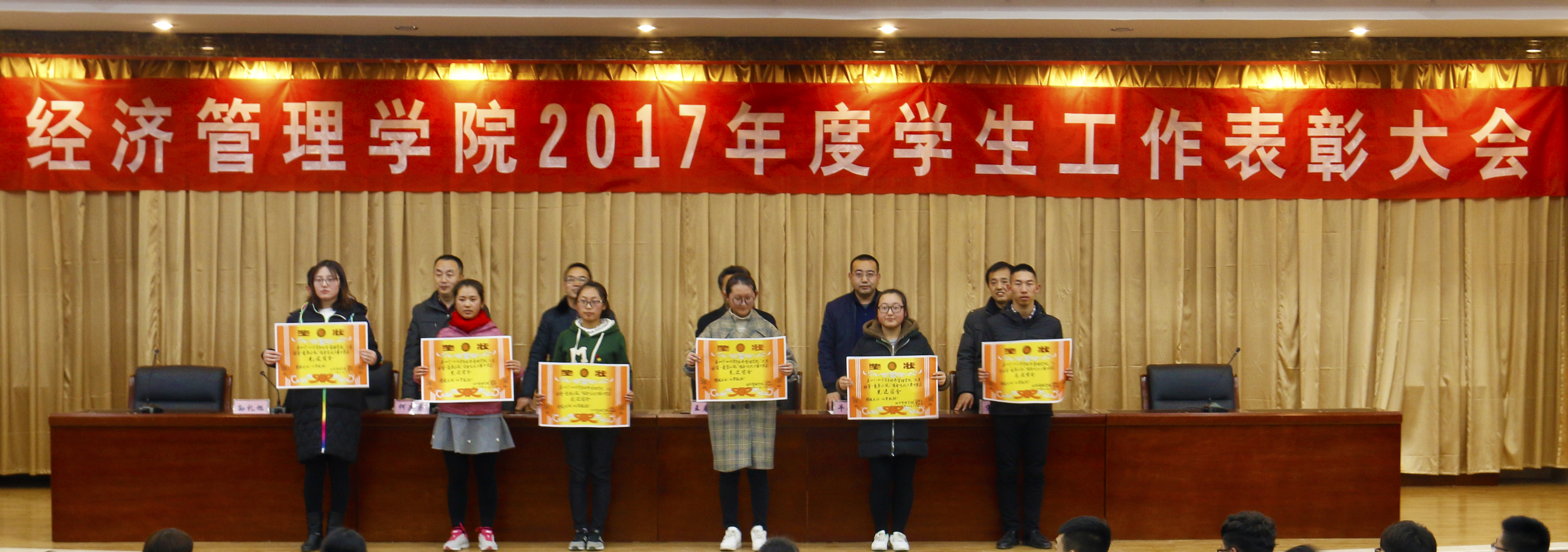 2017年12月18日,经济管理学院在第三学术报告厅举行2017年度学生工作表彰大会。学院党总支书记王春升、院长贾杰华、副院长牛永红、院办公室主任、学工办主任、团总支书记和全体大一学生及学生会成员参加了此次会议。 大会上,贾杰华宣读了《关于表彰经济管理学院2017年度学生工作先进个人和先进集体的决定》。牛永红、宋永智宣读了受表彰人员名单,并为获奖团体及优秀个人颁奖。 此次表彰大会,共有慕一丹、尹怡、臧鹏程、贾凯丽等34名同学受到表彰,人力17 班、财管17-1班等12个班集体获得荣誉。 王春升在讲话中希望学子们学有所思,学有所用,要牢记使命,鼎力前行,要做一位有思想有目标的大学生。