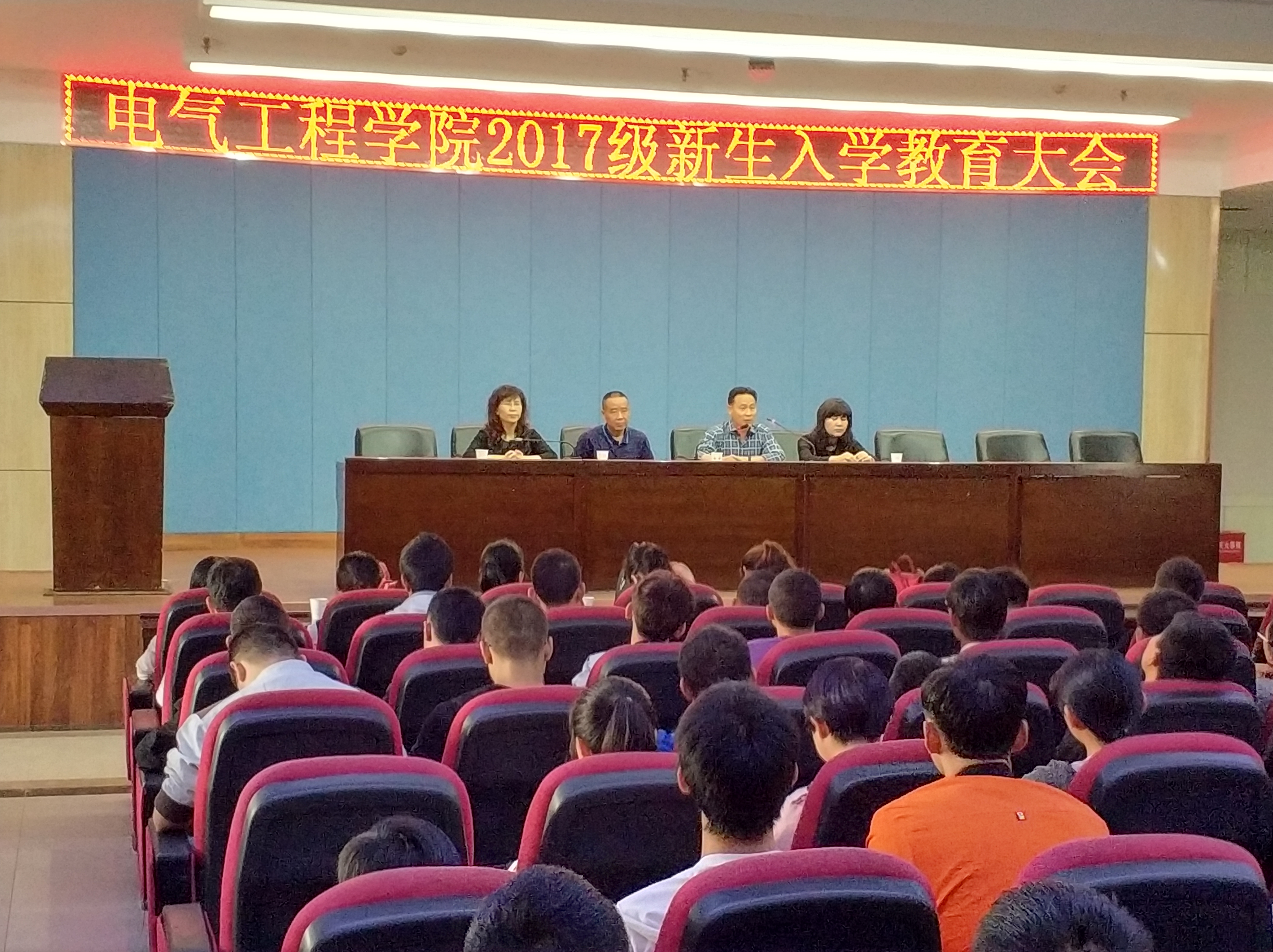 2017年9月3日上午,电气工程学院在八楼会议中心举办2017级新生入学教育大会。学院党总支书记吴安生,院长李双科,副院长张维玲、王淑红,学院副高以上职称教师,各教研室及实验中心主任,学工办、院办全体教师以及2017级全体新生参加了会议。张维玲主持会议。 会上,李双科介绍了学校、学院情况。自动化14-1班陶思源、自动化17-1班董娅锐分别代表老生、新生发言。最后吴安生致欢迎辞,欢迎新同学到来的同时对当代大学生就业形势作了简单的分析,告诫刚踏入大学校门的大一新生不仅要紧抓学习,还要发挥自己的特长,注重全面发展。