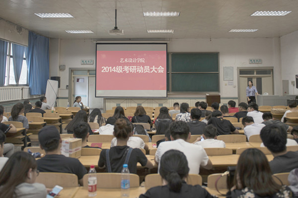 7月5日下午,艺术设计学院在阶梯101召开2014级考研动员大会。学院院长马牧群、视觉传达专业教研室主任滕艾娟、2014级班主任及14级140余名本科生参加了大会。 动员大会上,邀请了兰州理工大学设计艺术学院景楠博士作了考研专题报告。景楠详细介绍了兰州理工大学招收硕士研究生的条件和要求。艺术设计学院2017届学生研究生报考率为10%,上线5人,分别考取了陕西师范大学、中南林业科技大学、西安工业大学、英国南安普顿大学,这些成绩的取得为2014级同学提供了信心和渠道,使2018届毕业生有更加明确的目标。