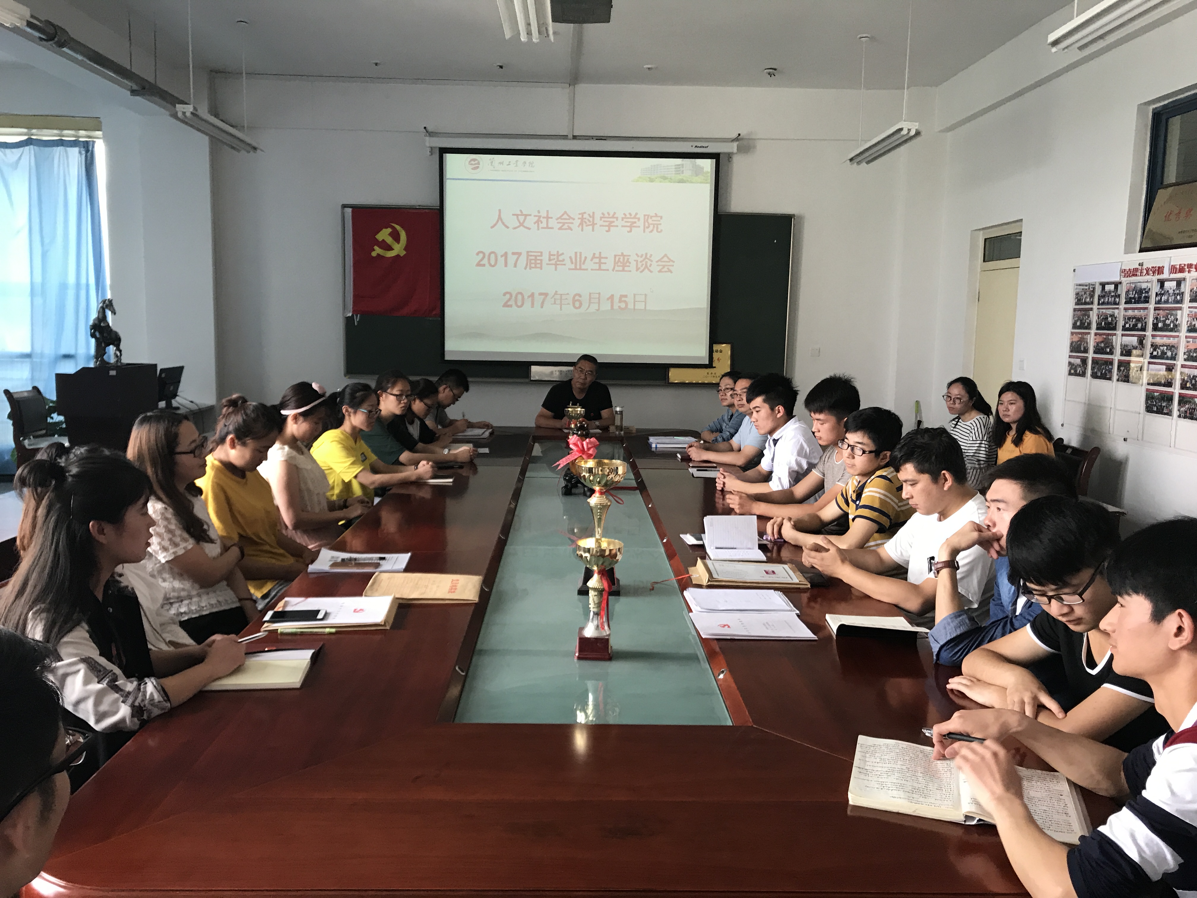 2017年6月15日上午,人文社会科学学院在学院会议室召开2017届毕业生座谈会暨毕业生党员大会。学院党总支书记刘军、学工办主任、各班班主任、毕业生代表、在校学生代表及全体毕业生党员参加了会议。学工办主任李雯娟主持座谈会。