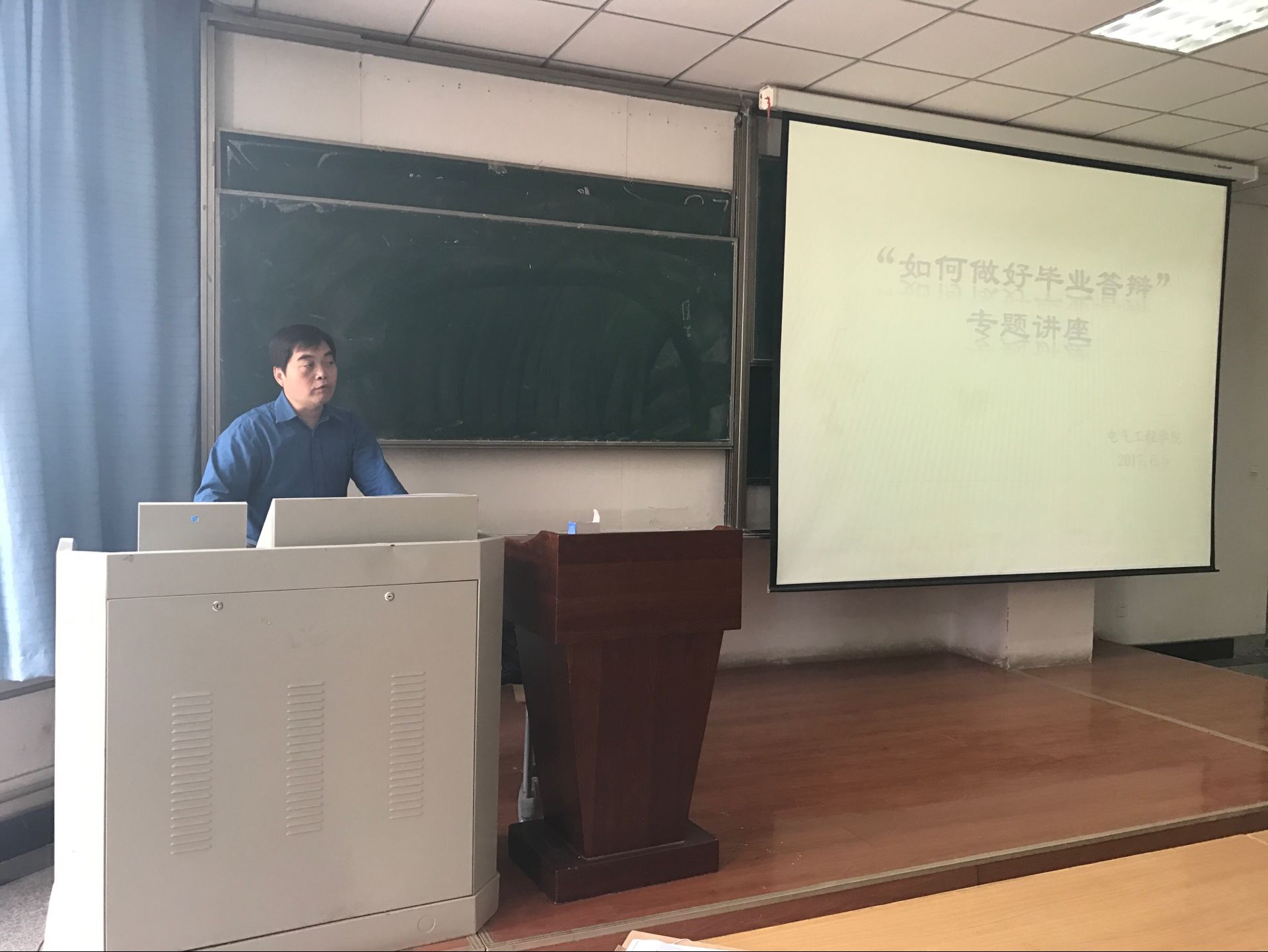 6月5日下午,电气工程学院在第四教学楼C101举办“如何做好毕业设计(论文)答辩”专题讲座。此次讲座由学院董红生教授主讲,部分教师和17届自动化专业全体毕业生聆听了讲座。 董红生从答辩的基本流程、答辩准备、现场答辩、PPT制作等四个方面作了详细讲解。他指出,PPT制作应突出主线,制作精美,包含课题名称、答辩人、指导教师、课题来源、研究目的、研究思路、研究过程、研究成果、研究结论等基本内容。答辩时,学生应仪表端庄、坦然镇定,回答准确、声音洪亮,对提出的问题在短时间内以自信而流畅、肯定的语气回答。此次讲座主题明确、内容丰富,受到了同学们一致好评。