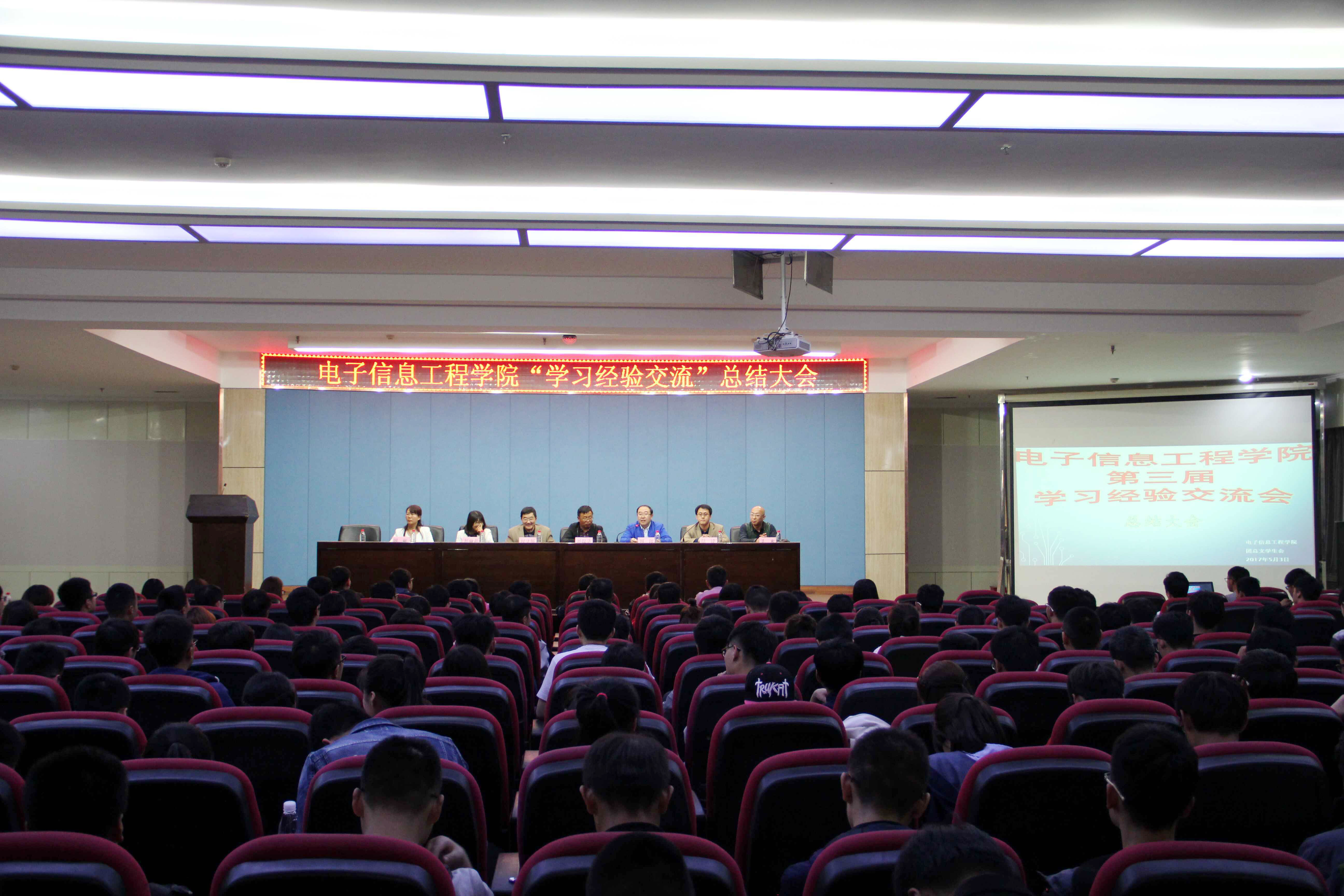 2017年5月3日晚,电子信息工程学院在八楼会议中心召开第三届学习经验交流总结大会。学院党总支书记刘保录,院长周征,副院长赵又新、陆斌以及学工办全体教师、本科班全体学生、专科班班干部参加了会议。陆斌主持会议。