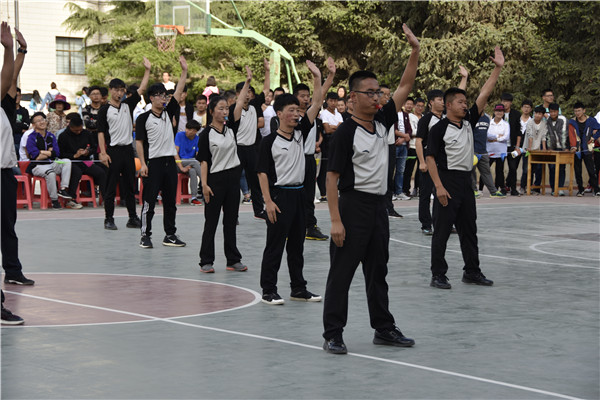 中场休息期间,篮球协会的全体裁判员为大家带来了裁判操表演。他们用整齐的动作,清脆的哨音向大家展示了一个裁判人应有的风度与气质。