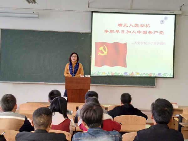 2017年4月11日下午,机电工程学院第一分党校在第四教学楼A216举行第十一期入党积极分子党课培训开学典礼。学院党总支书记、第一学生支部书记、第二学生支部书记以及82名入党积极分子参加了此次典礼。 第一学生支部书记杨永萍讲解了《党校管理办法—学员守则》,希望学员能自觉认真的执行守则内容,端正学习态度,积极参与党校组织的活动。 学院党总支书记张红岩在讲话中希望所有入党积极分子能够严格要求自己,认真履行自己的职责,能不断加强思想锻炼,不仅在组织上入党,更要在思想和行动上入党,争取早日光荣的成为中国共产党党员,更好的为人民为国家服务。
