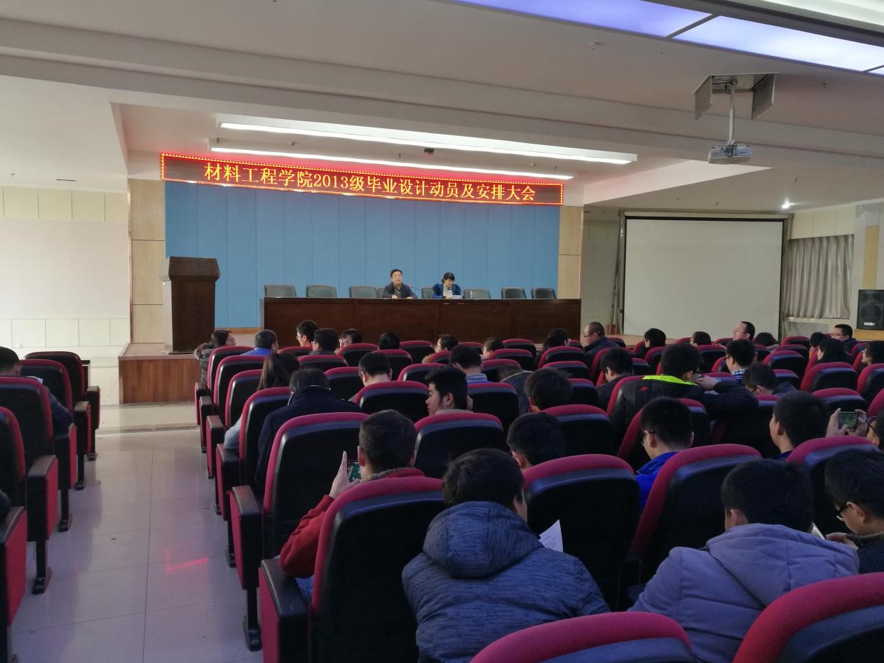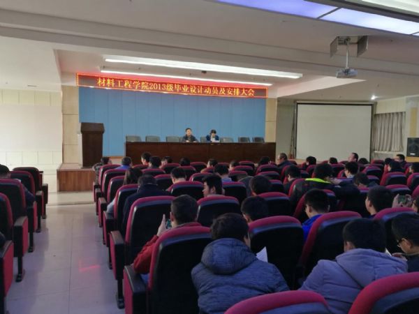 2017年1月11日下午,材料工程学院在八楼会议中心召开2013级毕业设计(论文)动员及安排大会。学院院长王明旭、副院长余华俐,2013级毕业设计全体指导教师及2013级全体学生参加了会议。 会上,王明旭要求指导教师和同学们高度重视毕业设计(论文)工作,正确认识、认真对待、严格要求,抓好过程、保质保量完成毕业设计(论文)。余华俐宣读了《材料工程学院2017届本科毕业设计(论文)安排》,对毕业设计进度中的主要节点做了具体要求和详细的说明。 会后,全体指导教师分别与所指导的学生见面,并进行了毕业设计任务书的下达和具体任务的讲解。
