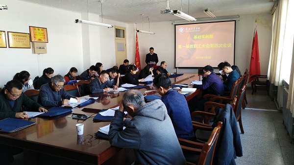 2017年1月5日,基础学科部召开第一届教职工大会第四次会议。会议由基础学科部党总支书记沈文国主持,基础学科部全体教职员工及部分退休职工参加了会议。 会议在雄壮的国歌声中开始,基础学科部副主任张豫冈致开幕词。基础学科部主任祁忠斌作了《基础学科部2016年工作报告》和《基础学科部2016年度经费收支情况报告》。与会教职工就两个报告进行了讨论,并对部门今后的发展提出了宝贵的意见和建议。会议总结了基础学科部一年来取得的成绩和不足,确定了今后一个时期基础学科部的重点工作。 在完成各项议程后,沈文国作了大会总结,并宣布大会胜利闭幕。
