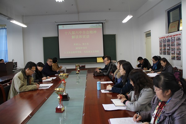 12月13日下午,马克思主义学院在院会议室专题学习党的十八届六中全会和全国高校思想政治教育工作会议精神。学院党总支书记刘军主持会议。全院专职教师参加了学习。