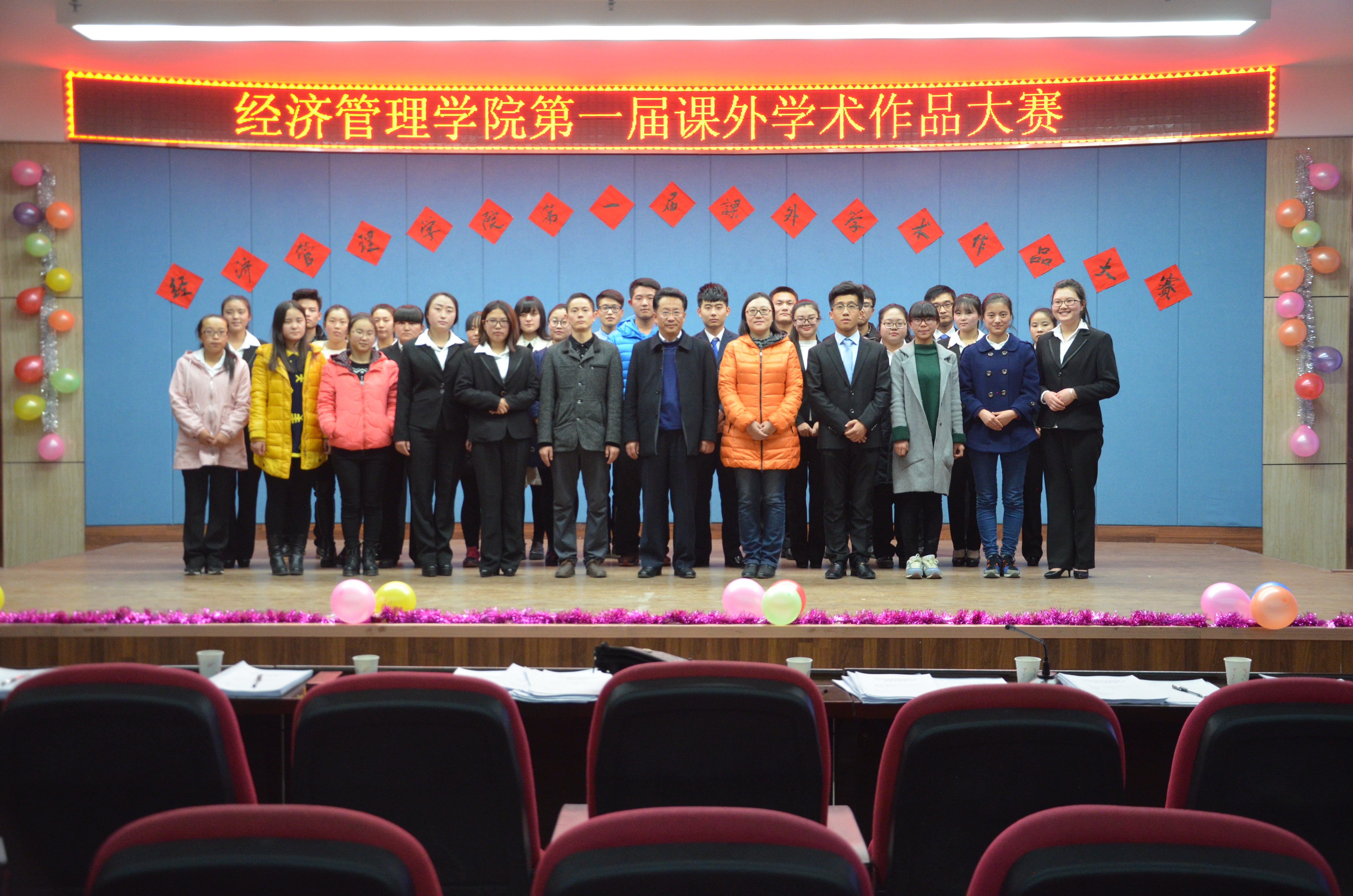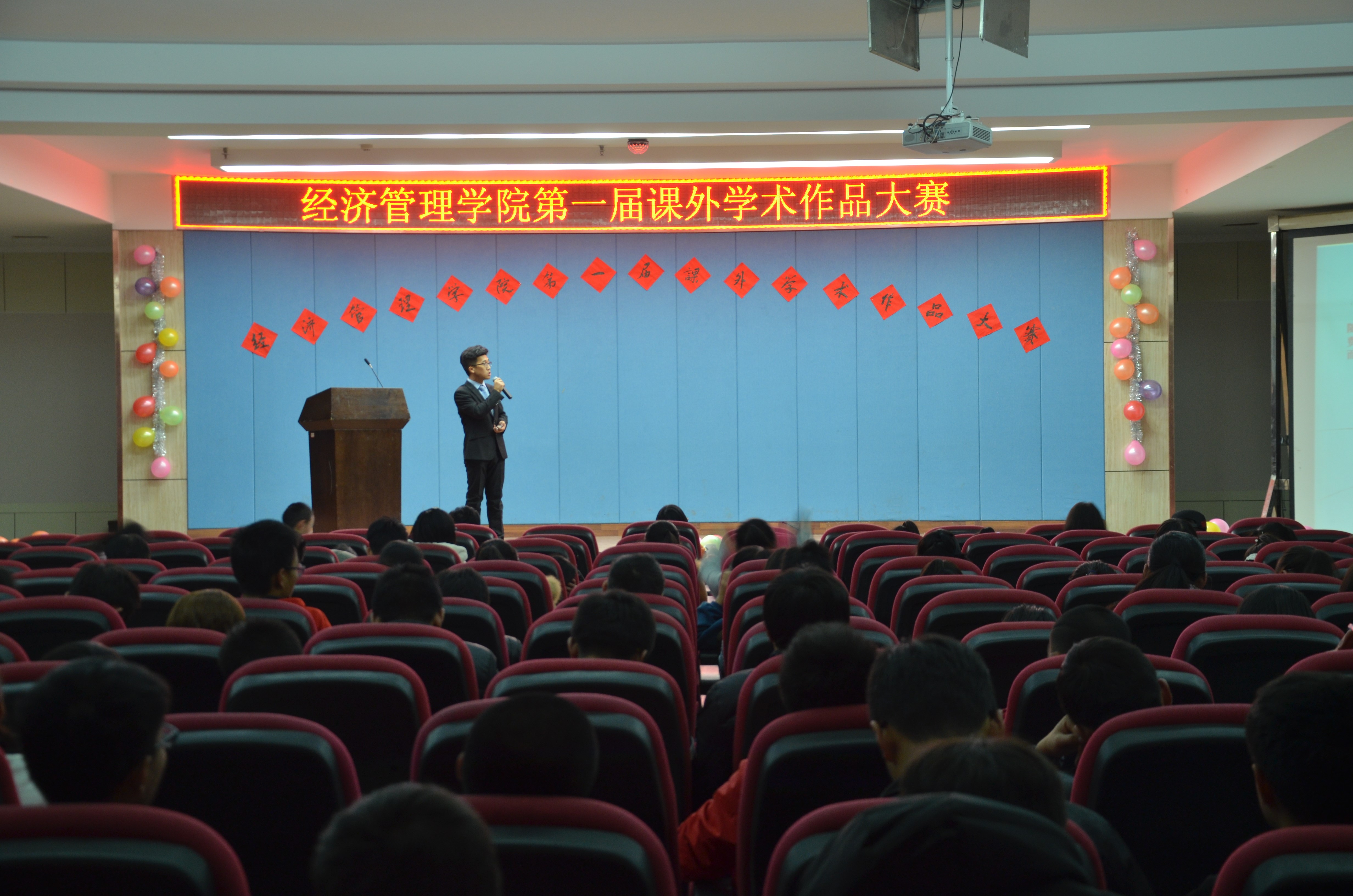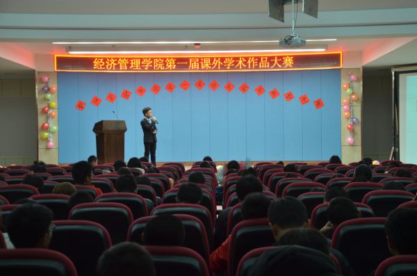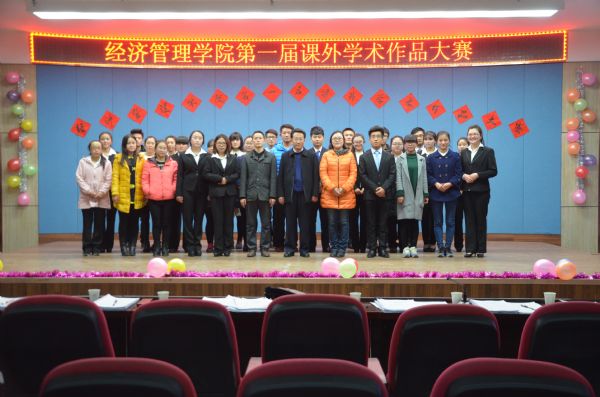 11月22日下午,经济管理学院在八楼会议中心举办第一届课外作品学术大赛。校团委书记李萍、经济管理学院党总支书记王春升、副院长牛永红以及学院部分师生参加了活动。 此次比赛共有15个优秀团队参加,分别以社会科学、自然科学、社会调查为主题展开竞赛,比赛由PPT展示和答辩两部分组成。各参赛团队代表通过演讲和精美幻灯片展示出自己团队的特色和优势,充分地展现了团队创新成果。