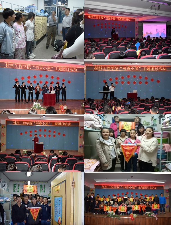 学院团总支组织各班召开了专题动员会,安排部署“文明宿舍” 创建工作,向同学们发出倡议书,制定了《材料工程学院文明宿舍建设标准》。学院领导、辅导员、班主任定期深入宿舍进行卫生检查,对卫生整洁、文化氛围好的宿舍提出表扬,对较差的宿舍通报批评,并要求定期整改;对于宿舍违纪、校外住宿、晚归的学生,学院及时进行了批评教育或纪律处分。学院要求学生党员和学生干部做好带头示范作用,寝室内开展“一帮一”活动。同时,学院制作了流动红旗、优秀宿舍标示牌,并拿出经费用于表彰每月产生的文明宿舍。11月24日晚,学院在八楼会议中心举行了“书香小屋”主题团日活动,在卫生评比中获得先进的13个宿舍,通过ppt展示、才艺展演等集中展示了宿舍文化氛围。