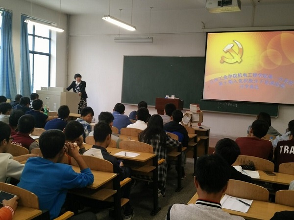 2016年10月8日下午,机电工程学院分党校在第四教学楼A216教室举行第十期入党积极分子党课培训开学典礼。学院副院长、第一学生支部书记杨永萍、第二学生支部书记马青丽以及本期61名入党积极分子参加了开学典礼。 在开学典礼上,杨永萍代表学院党总支对同学们来参加党课培训学习表示热烈欢迎,同时强调了参加入党积极分子培训的必要性以及学院党课培训管理制度。杨永萍希望同学们从自身做起、端正态度、认真学习、积极参加各项实践活动,严于律己,争取早日入党。