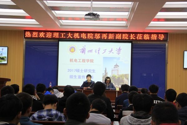 10月9日上午,机电工程学院邀请兰州理工大学机电工程学院负责研究生招生的邬再新副院长、副教授来学院开展研究生招生宣讲工作。学院党总支书记张红岩、副院长罗文翠、副院长杨永萍、2017届毕业班辅导员以及准备考研的2013、2014级120余名学生参加了宣讲会。 邬再新介绍了兰州理工大学机电工程学院的办学历史、师资力量、研究生专业设置、学院优秀生源奖励政策、研究生复试科目以及近年来研究生专业课出题情况等,并针对同学们提出的问题作了详细解答。 通过此次考研推进会,学院学生对目前考研形势和备考工作有了进一步的认识和理解,激发了同学们考研的信心和热情,为备战考研的同学们提供了一个宝贵的学习机会。