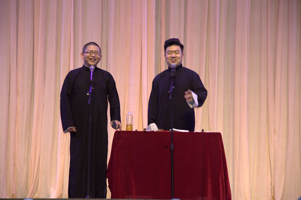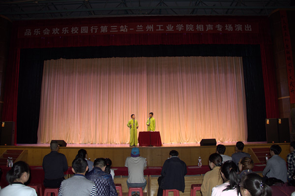 演出在相声《欢歌校园》中拉开帷幕,来自兰州品乐相声会馆的马梁、王家琛、郭晨、倪佳君等演员一展他们扎实的“说学 逗 唱”基本功,演出中包袱不断,表演精彩纷呈,全场欢声笑语,掌声雷动。
