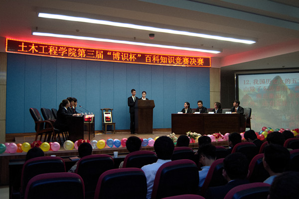 2016年4月19日晚,土木工程学院在八楼会议中心举行第三届“博识杯”百科知识竞赛决赛。学院副院长陈玉梅、团总支书记臧文茜、部分辅导员及15级全体学生观看了本次竞赛。