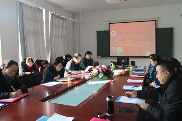 2015年12月29日下午,外国语学院第一届教职工大会第三次会议在学院会议室召开。副校长李贵山出席会议,学院党总支书记王雄堂主持会议,外国语学院全体教职工参加了会议。