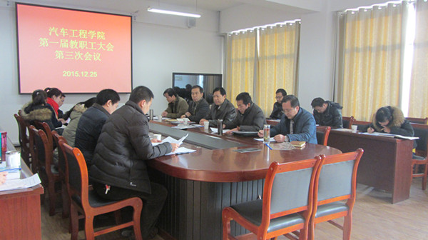2015年12月25日,汽车工程学院第一届教职工大会第三次会议在学院五楼会议室召开。副校长马铁信出席会议。宣传部副部长黄园军、汽车工程学院全体教职工参加了会议,学院党支部书记张得太主持会议。