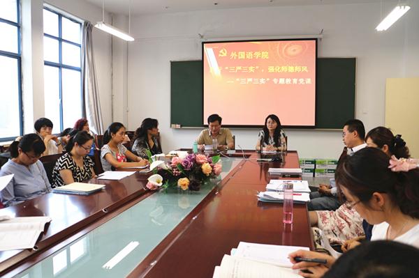 外国语学院党总支书记王雄堂传达了学校有关会议精神,并作了题为《践行“三严三实”,强化师风师德》的专题教育党课。