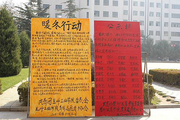 为了帮助贫困地区老人和孩子度过一个温暖的冬天,2014年11月初,我校青年志愿者协会在全校范围内发起爱心捐衣“暖冬行动”。该活动得到我校老师及广大青年学子的热情参与,捐赠者络绎不绝,最终在兰州客运中心的协助下将捆扎好的千余件衣物发到定西市通渭县榜罗镇积麻村等十余个贫困村落村民手中。