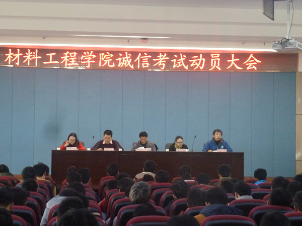 为加强学风建设,严肃考风考纪,2015年1月5日,材料工程学院在八楼会议中心召开诚信考试动员大会。学院党总支书记韩国才、副院长贾魁出席大会,辅导员郭峰、李娟娟、武明以及2013级、2014级600余名学生参加大会。