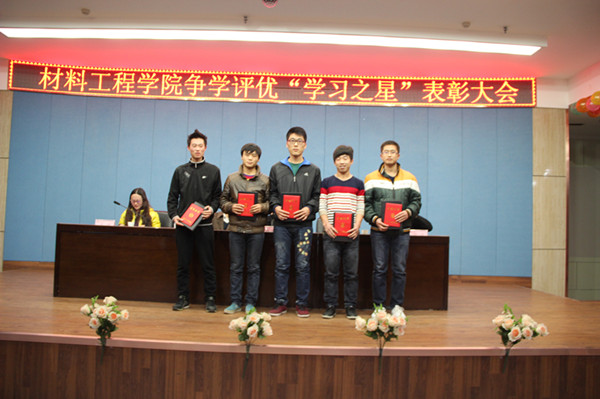 材料工程学院为了加强学风建设,不断激发同学们学习的积极性和主动性,使学生在学习上形成“比、学、赶、帮、超”的良好氛围,制定了《材料工程学院“争学评优”评定细则》,对每学期专业课平均成绩在85分以上,专业课单科成绩在95分以上的学生进行表彰。本次表彰共有李安等46名同学获得2014-2015学年第一学期“学习之星”的荣誉称号。