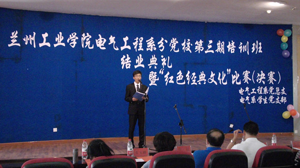 2013年6月4日,电气工程系分党校入党积极分子培训班第三期党课结业典礼暨“红色经典文化”比赛(决赛)在八楼会议中心举行。电气工程系党政领导及各级辅导员出席了本次典礼。