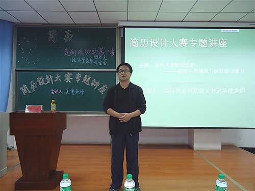 5月25日晚,由校团委主办,经济贸易系承办的第二届“简历设计大赛”第一阶段专题讲座在第四教学楼C102教室举行。各社团、各系学生会负责人以及参加简历大赛的选手参加了讲座。本次讲座由经济贸易系党总支书记吴倩主讲。 吴倩以“如何从求职到优职”为主题,为同学们进行了讲解。他通过分析大学生的自身条件和现代社会的就业形势,为当代大学生就业求职作出了宝贵指导。此外,他还深刻细致地讲解了成功简历的制作技巧。最后,他指出,大学生应当从宏观和个人,内部和外部多方面多角度出发,认清就业形势,不要陷入自我期望过高,迷恋大型企业,追求热门企业的误区。