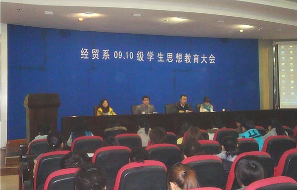 3月9日晚,经济贸易系09级、10级学生思想教育大会在八楼学术报告厅召开。经济贸易系党总支书记、全体学生政治辅导员及09级、10级的学生参加了大会。大会由经济贸易系学工办主任何志勇主持。