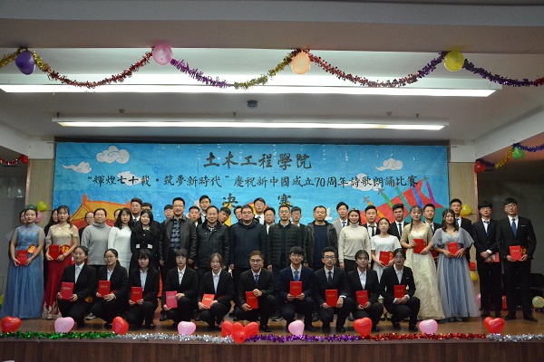 2019年12月12日晚,土木工程学院在八楼会议中心举办 “辉煌七十载·筑梦新时代”庆祝新中国成立70周年诗歌朗诵比赛决赛。学院党委书记赵万双、校团委书记王斌、学院副院长任永忠和部分师生一同观看了比赛。 本次比赛共有14组选手。选手们的朗诵声情并茂,内容积极向上,现场掌声经久不息。经过激烈角逐,土木18-2班的《我爱你中国》获一等奖,建环18的《泱泱中华,萧萧大河》、造价19班的《我爱你,我的祖国》、土木19-2班的《高原上的小茶花》分获二等奖,土木19-4、建环19、土木19-1、造价19班分获三等奖。