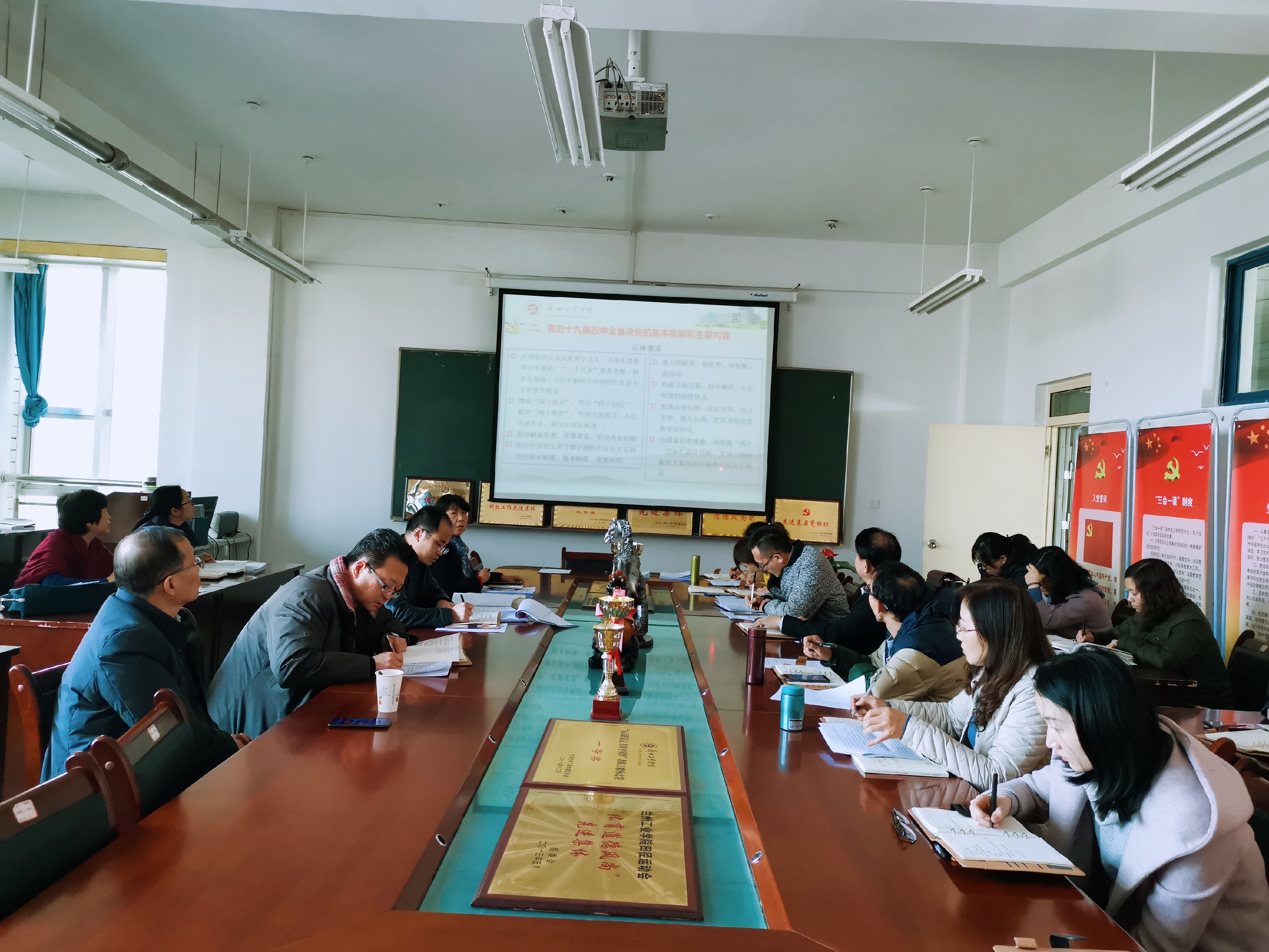 会议强调,全体教师党员要继续深入学习党的十九届四中全会精神,坚定中国特色社会主义制度自信,坚持开拓创新、团结奋进的精神,弘扬党的优良传统和作风,争做合格的共产党员;继续发挥马克思主义理论学科优势,加强对习近平新时代中国特色社会主义思想的研究阐释。同时,立足思想政治理论课教学,将学习情况及时融入思政课教学中去,进一步提高思政课的实效性和吸引力,深化推动党的十九届四中全会精神进教材、进课堂、进头脑。