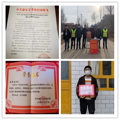 近日,中共康乐县委组织部发来《关于马学义同学在新冠肺炎疫情防控期间现实表现情况的函》,对我校机电工程学院机械电子工程19-1班学生马学义在疫情期间主动请战,挺身而出,夜以继日地奋战在疫情防控一线的突出表现,提出了表扬。 马学义是我校机电工程学院机械电子工程19-1班学生,也是一名共青团员,在新冠肺炎疫情发生后,他积极响应党的号召,主动申请参加疫情防控工作,第一时间投入“战斗”。从早上8点到晚上9点,在村庄主干道值班值守,入户排查、宣传引导,为有效防控疫情、保护人民群众的生命安全和身体健康贡献了青春力量,充分展现了新时代有志青年的使命与担当。