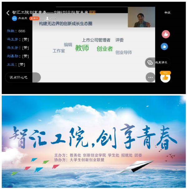 4月17日晚,创新创业学院通过"陇政钉"移动办公平台组织开展线上讲座活动,我校创新创业导师,北京投智网络科技有限公司CEO、创新创业引导研究院院长、中国人力资源开发研究会理事、美国格理集团行业专家顾问张文莉为广大师生作 “创新创业,投智未来”专题讲座,全校1315名师生收看本次讲座。 张文莉以自身为例,就大学生创新创业时如何组建团队、挖掘好的项目等问题,和师生们在线互动交流,解答师生们遇到的问题,并提供了线上云资源、云需求、云项目、云导师等丰富的免费资源。 本次活动为我校疫情期间师生创新创业提供了学习交流机会,进一步激发了学生创新创业热情,提高了学生就业创业能力。
