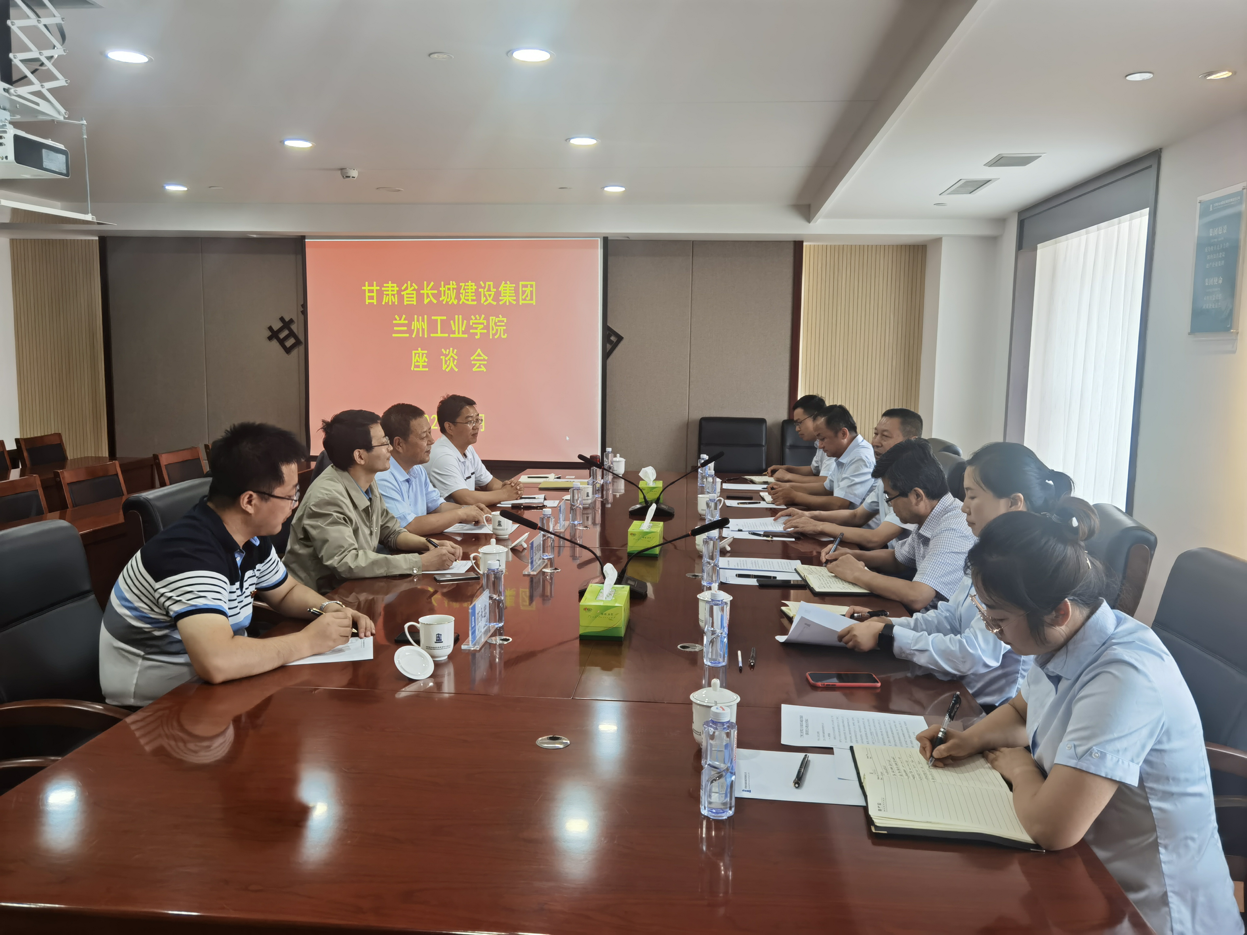 座谈会上,与会人员观看了企业宣传片,李兴民介绍了甘肃长城建设集团的基本情况和近年来的发展成就,并对我校校友在企业的发展情况作了介绍。马守才就进一步深化校企合作,加强校企双方在毕业生就业、实习实训、长城奖学金评选、产教融合等方面和企业领导进行了沟通,并就企业订单班培养、科技联合攻关和项目申报等方面达成初步合作意向。