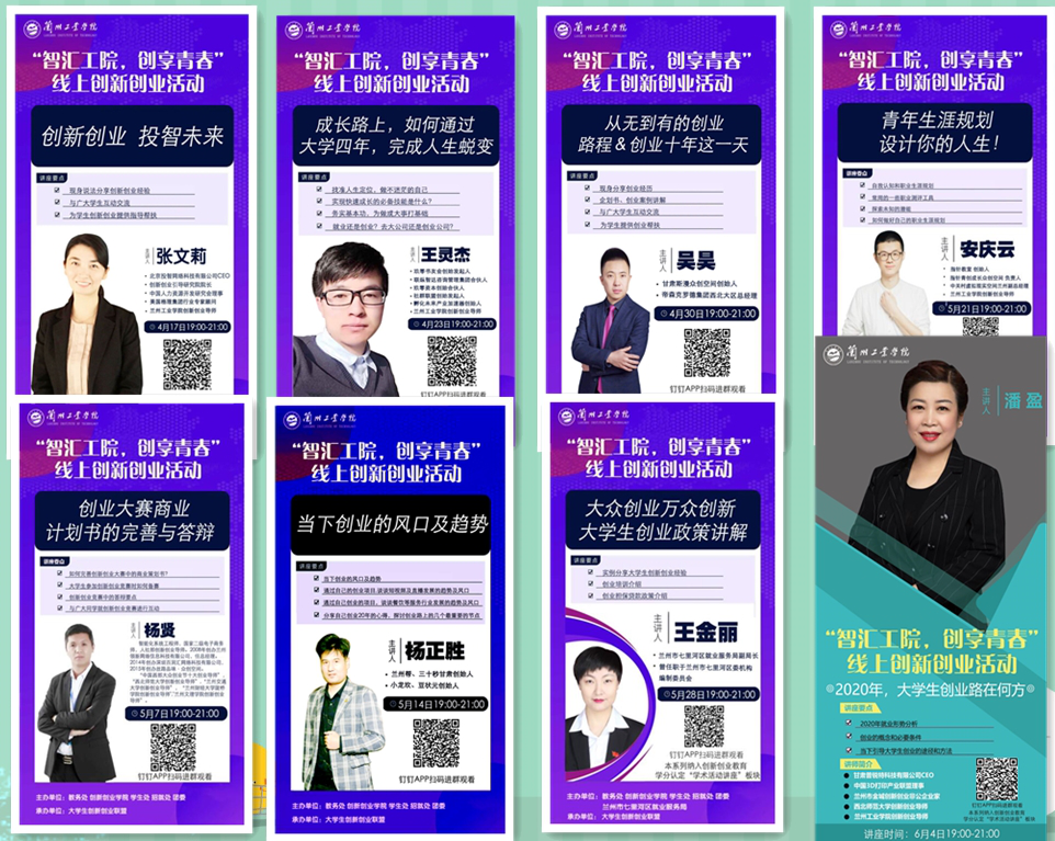 自4月17日以来,教务处、创新创业学院、学生处、招就处和团委多部门联合通过“陇政钉”线上组织举行“智汇工院,创享青春”系列创新创业活动。活动邀请成功创业者、行业企业精英、地方政府就业创业部门负责人等校外创新创业导师,定期给我校大学生带来最新的创业视角,最靠谱的创业经验,最优质的创业服务,最接地气的就业创业资源。