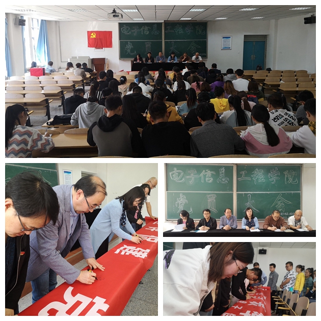 9月29日,电子信息工程学院在四教C101召开“迎评促建 党员先行 担当表率 争做先锋”倡议签名活动,学院党委委员、全体师生党员参加此次活动。